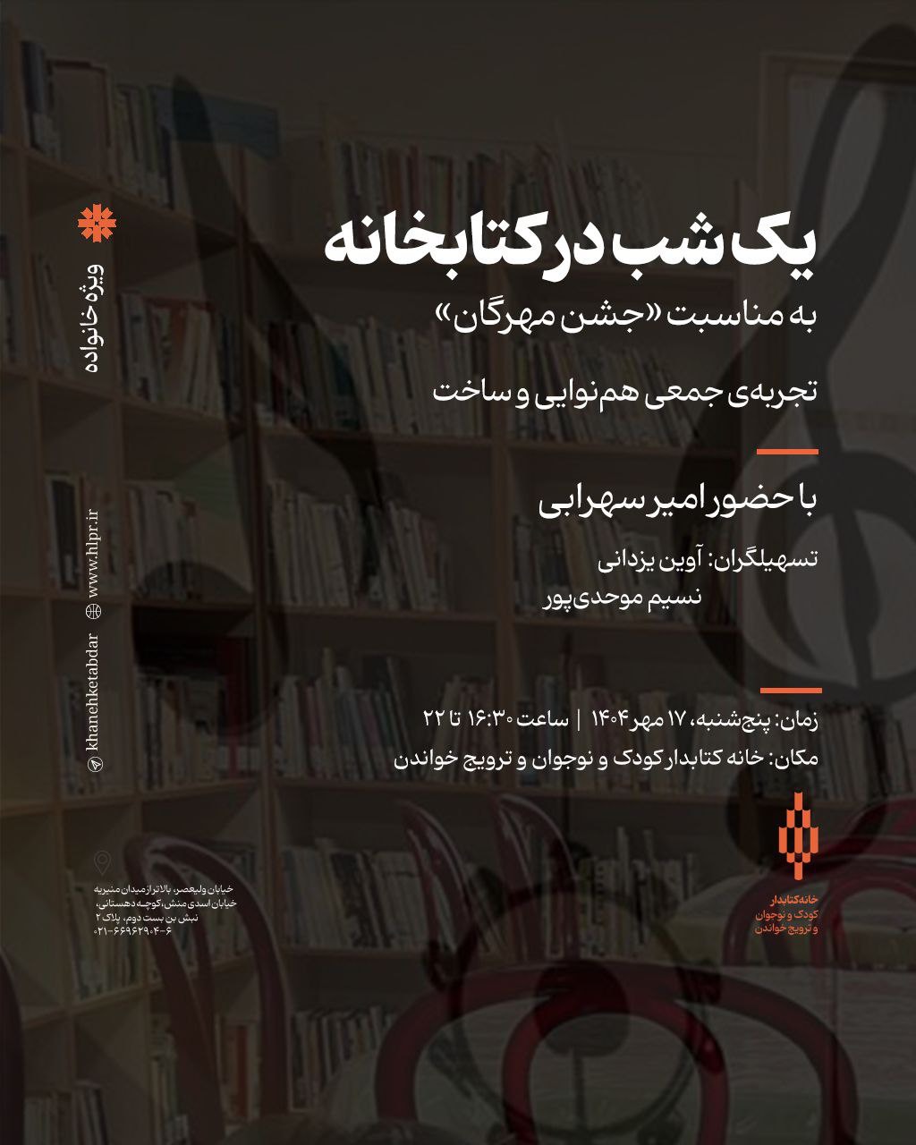 فصل بهار، یک شب را به مناسبت شب کتاب، در کتابخانه گذراندیم. کنار هم بودن درکتابخانه با صدای شب، تجربه متفاوتی بود. به مناسبت جشن مهرگان، میخواهیم شب دیگری را در کتابخانه و باهم بگذرانیم. امیر سهرابی، پژوهشگر فرهنگ و کودکی، همراه ماست و قرار است از مهرگان بیشتر بدانیم. عروسک ورزامشته را کنار هم بسازیم. کارآوا زمزمه کنیم. با حال و هوای فصل پاییز و دگرگونی طبیعت همنوا شویم و طرحی نو دراندازیم. روشهای خلاقانه ساختن ریتم را باهم تمرین کنیم و بزرگترها و کوچکترها اجرای یکدیگر را ببینیم و بشنویم. به جشن مهر و اعتدال خوش آمدید و منتظر دیدارتان هستیم. زمان: پنجشنبه ۱۷ مهر ساعت: ۱۶:۳۰ تا ۲۲ مکان: خانه کتابدار راه ارتباطی برای ثبتنام: