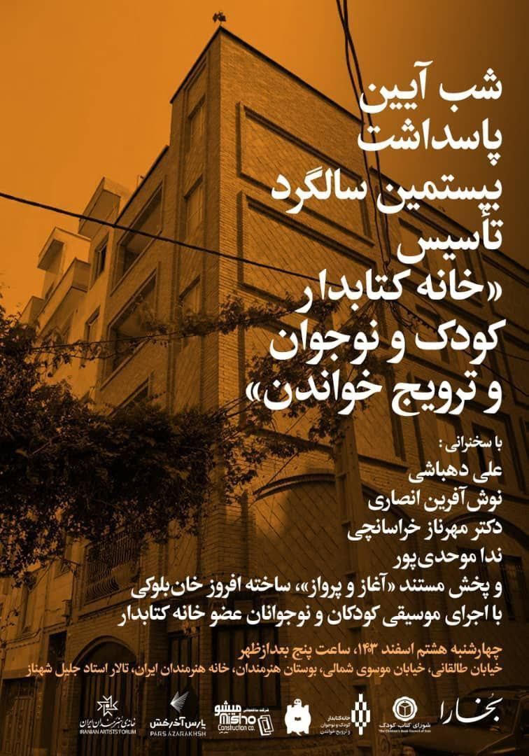 شب آیین پاسداشت بیستمین سالگرد تاسیس «خانه کتابدار کودک و نوجوان» بیستمین سالگرد «خانه کتابدار کودک و نوجوان و ترویج خواندن»، در شب هشتصد و بیست و پنجم از شبهای بخارا، چهارشنبه ۸ اسفند ۱۴۰۳ در خانه هنرمندان ایران برگزار میشود. در این برنامه علی دهباشی، نوشآفرین انصاری، مهرناز خراسانچی و ندا موحدیپور سخنرانی خواهند کرد. پخش مستند «آغازِ پرواز» ساخته افروز خانبلوکی و اجرای موسیقی کودکان و نوجوانان عضو خانه کتابدار از بخشهای دیگر برنامه هستند. «خانه کتابدار کودک و نوجوان و ترویج خواندن» یک کتابخانهی عمومی کودک محور است که در سال ۱۳۸۳ تاسیس شده و فضای خود را در روند همفکریهای پویای «کتابداران» و «مروجان» ساخته است. هدف اصلی این نهاد از ابتدا «ترویج ادبیات و خواندن» در میان کودکان، نوجوانان و خانوادهها با انجام طرحهای خلاقانه و به کمک نهادهای همسو بوده است. بیستمین سالگرد «خانه کتابدار کودک و نوجوان و ترویج خواندن» ساعت ۱۷ چهارشنبه ۸ اسفند ۱۴۰۳ در سالن استاد شهناز خانه هنرمندان ایران برگزار خواهد شد.